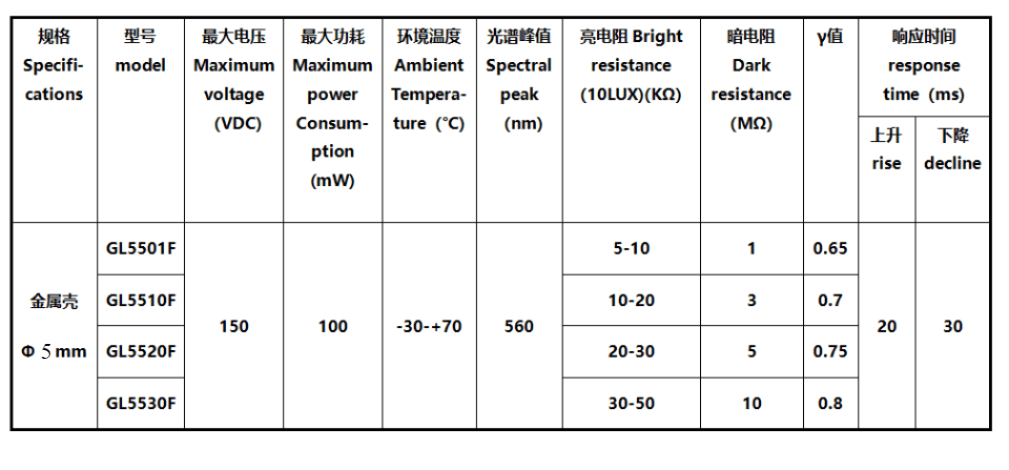 GL5501F:亮电阻Light Resistance at 10Lux(KΩ) 5-10
