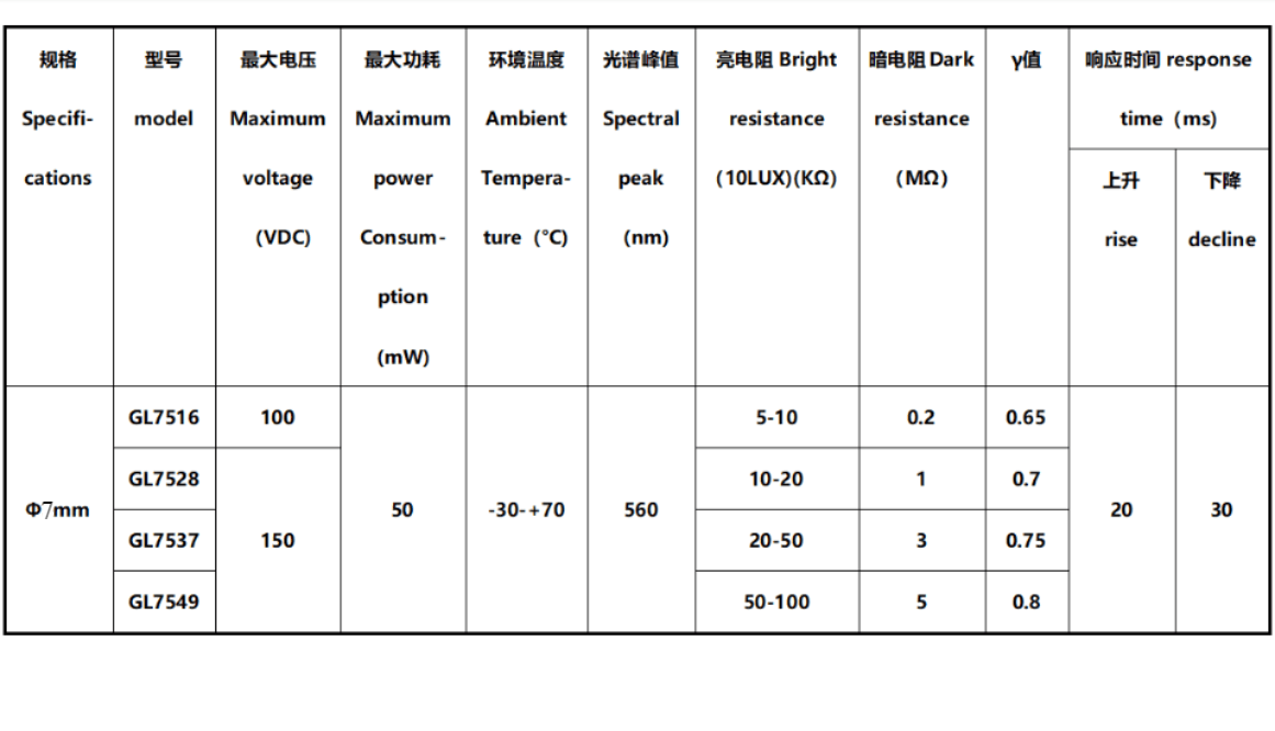 GL7501:亮电阻Light Resistance at 10Lux(KΩ) 5-10
