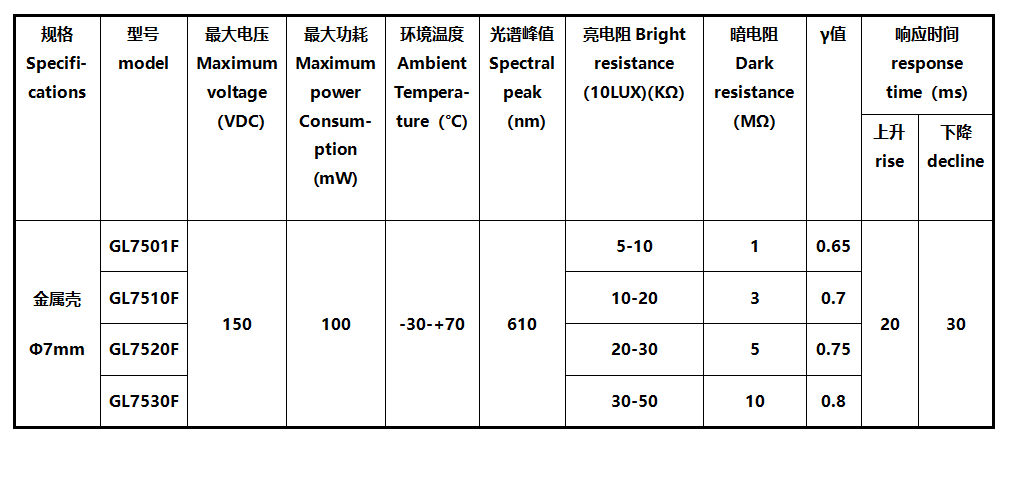 GL7501F:亮电阻Light Resistance at 10Lux(KΩ) 5-10
