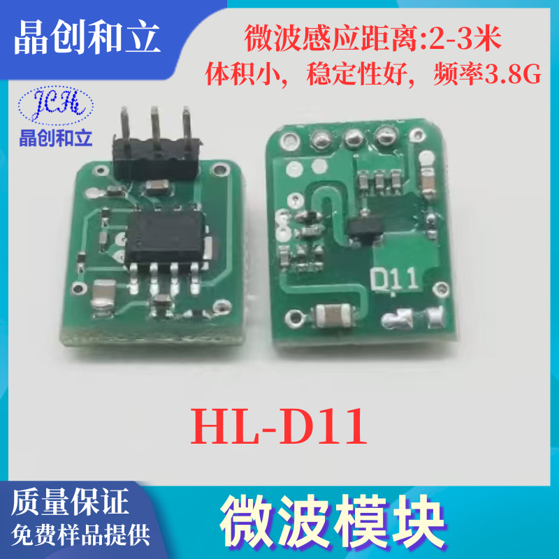 The HL-D11 has dimensions of 14X12mm, a power supply voltage of 3.1-12VDC, and an operating current of 2-3mA. When someone enters the detection range of this product, the microwave radar sensing module's output Vout will output a TTL high level. After a delay period (operating delay), the output will return to a TTL low level. After the sensing module is activated, if there is human activity during the delay period, the module's output Vout will continue to output a TTL high level until the person leaves and a delay period (operating delay) has passed, after which the output will return to a low level.