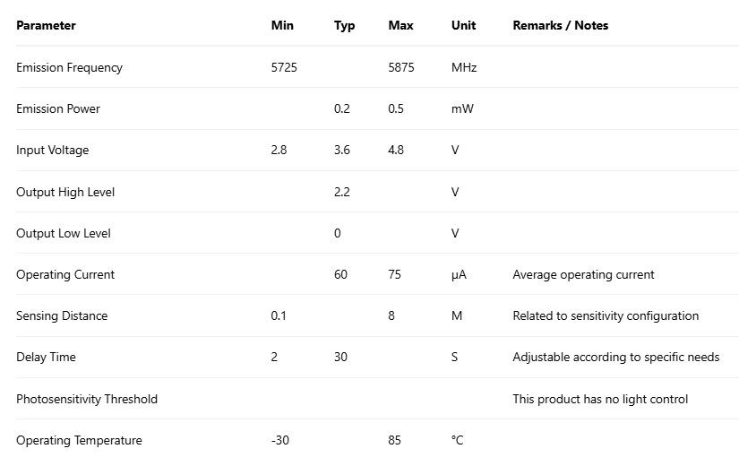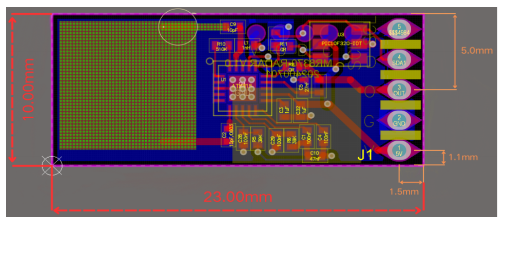 HL1023-5.8G is an ultra-low-power 5.8G radar sensor launched by Jingchuang and Li, with a total power consumption of 60uA. The module measures 10mm * 23mm. The sensor uses a radar sensing chip, which fully integrates a 5.8G microwave circuit, intermediate frequency amplifier circuit, and signal processor, offering high integration and good production consistency.