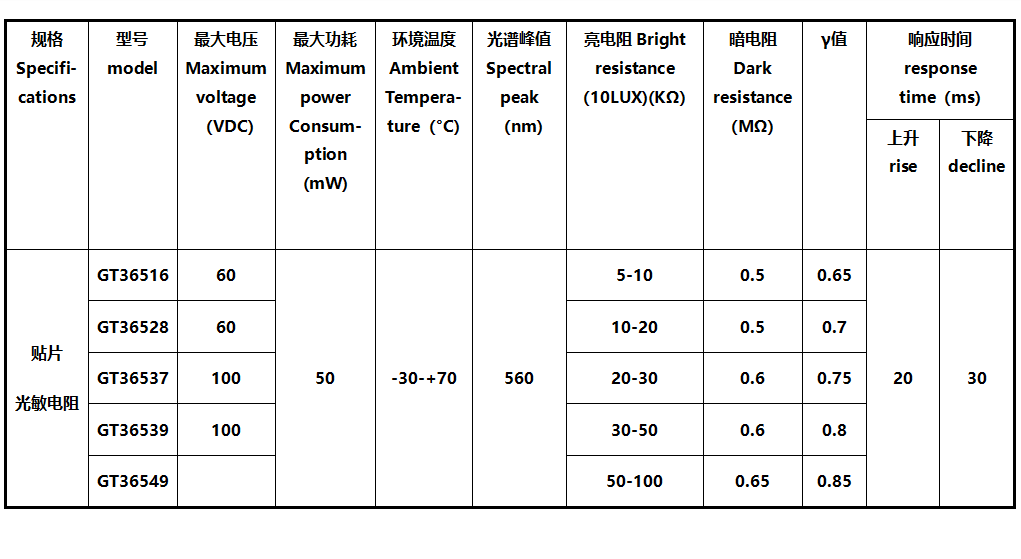 GT36539:Light Resistance at10Lux(KΩ) 30-50